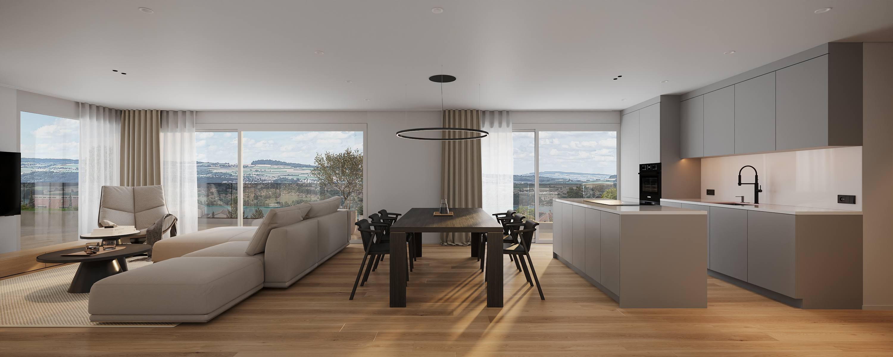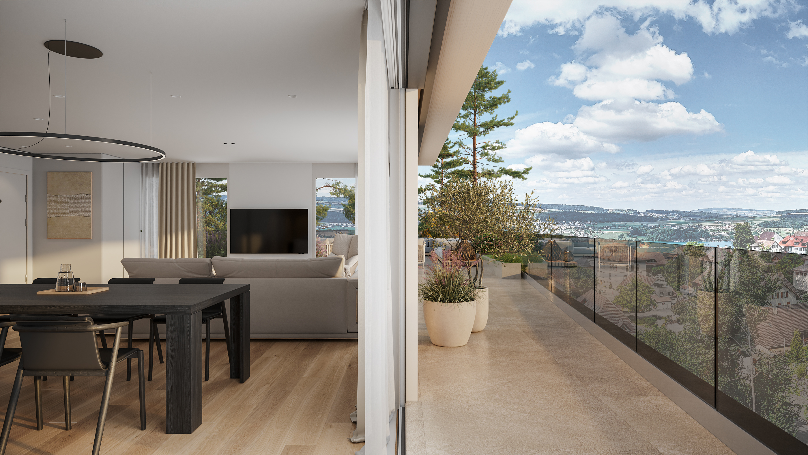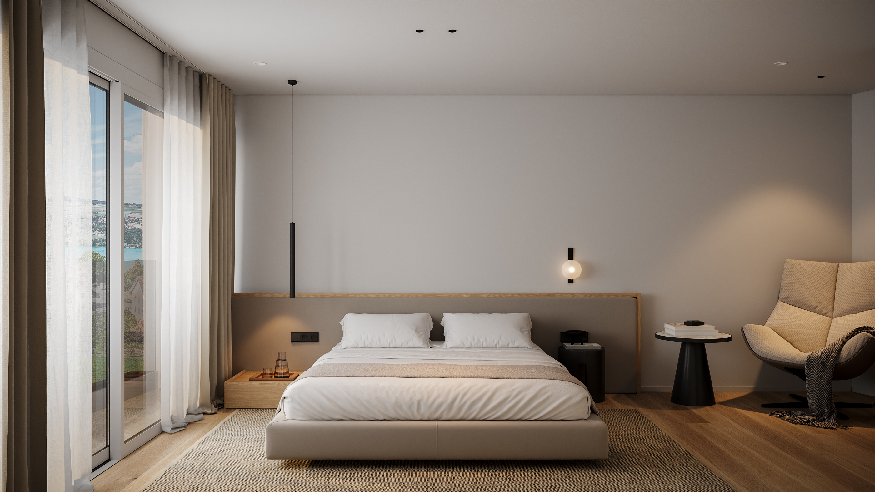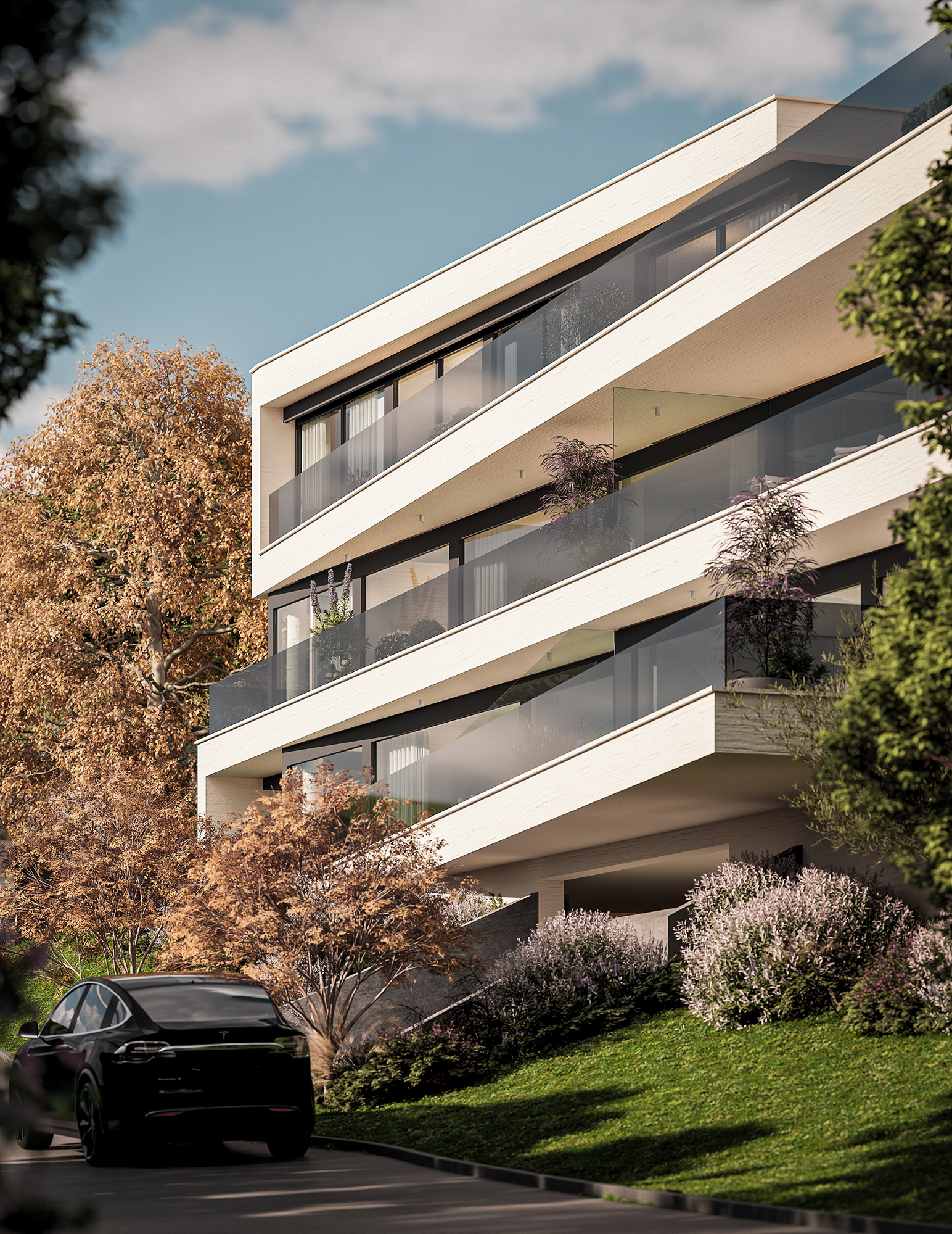 Die Architektur lehnt sich an die natürliche Umgebung am See an. Mit grossen Glasflächen öffnen sich die Innenräume Richtung Aussen. Materialien wie Feinbeton und Glas fliessen harmonisch zusammen und erzeugen eine moderne, warme Atmosphäre. So entsteht ein Zuhause mit Eleganz und Stil.